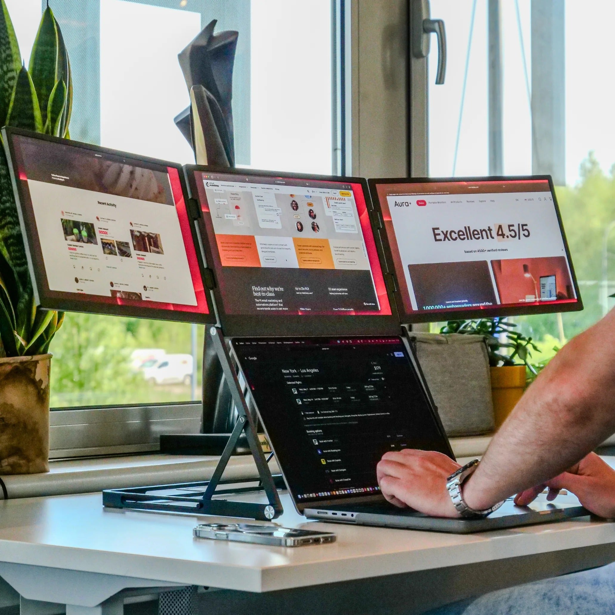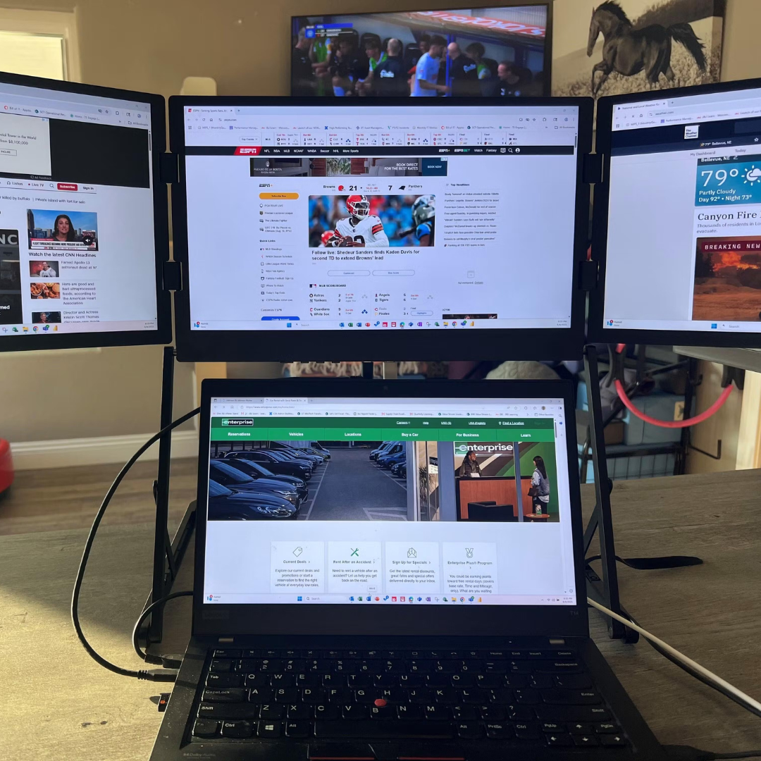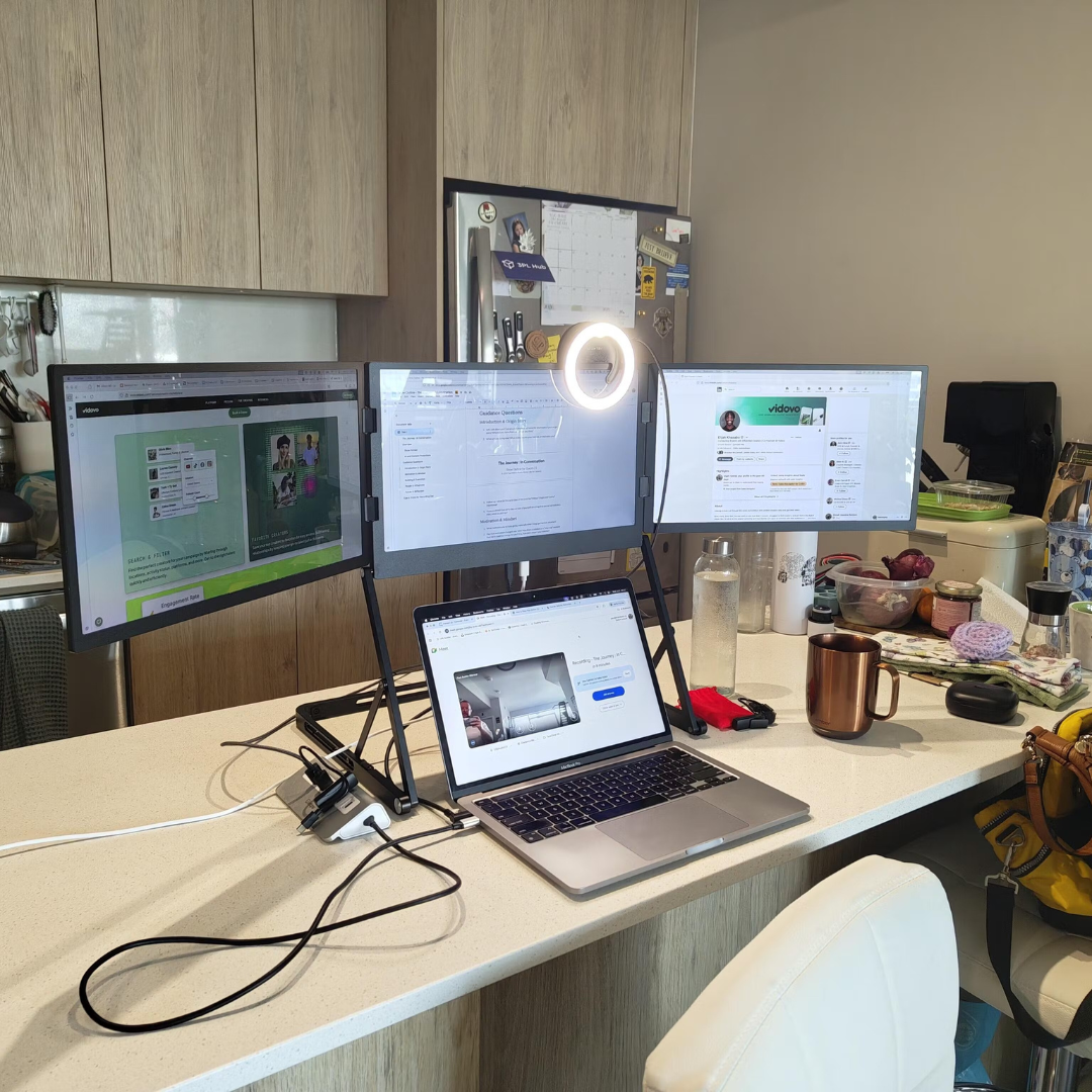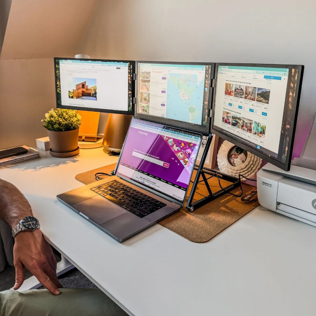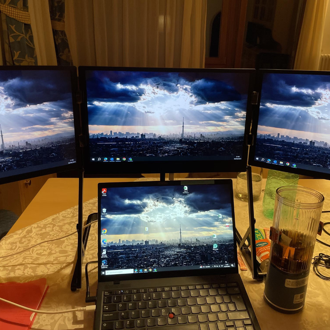 This portable triple-screen monitor has made multitasking effortless on the go. The matte IPS Full HD panels stay clear in bright spaces, and setup was quick with the one-time driver. USB-C power with the included 65W adapter runs all three displays, and the built-in speakers are great for calls. The aluminium build and kickstand feel sturdy while staying easy to carry.
